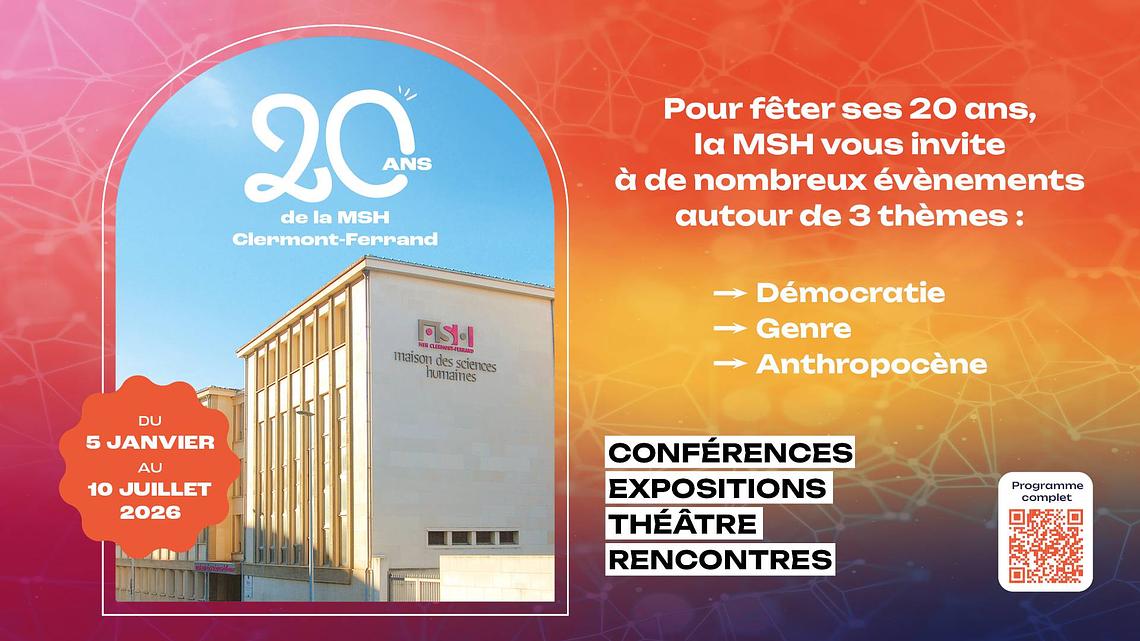 La Maison des Sciences Humaines de Clermont-Ferrand fête ses 20 ans ! Du 5 janvier au 10 juillet 2026, toute son équipe vous propose une programmation riche et diversifiée qui met à l’honneur trois grandes thématiques en lien avec les débats qui traversent l’actualité : la démocratie, l’Anthropocène et le genre. Conférences, expositions, concours photo étudiant, représentations théâtrales… Autant de rendez-vous pour ouvrir les horizons, susciter les échanges, nourrir la réflexion et célébrer ensemble vingt années de science, de recherche et de partage des connaissances. À vos agendas !