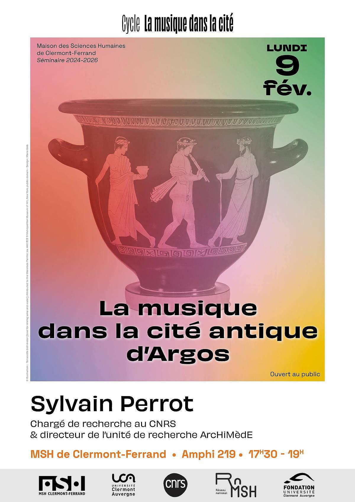 Dans le cadre du séminaire interdisciplinaire de la Maison des Sciences Humaines de Clermont-Ferrand (UAR 3550) « La musique dans la cité », Sylvain Perrot, agrégé de lettres classiques, chargé de recherche au CNRS, directeur de l’unité de recherche ArcHiMèdE (Strasbourg), donnera une conférence sur « La musique dans la cité antique d’Argos » le 9 février 2026 à la MSH de Clermont-Ferrand (amphi 219). Entrée libre et gratuite.