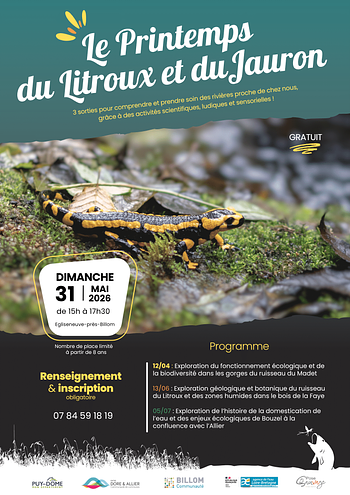 Les rivières et les milieux aquatiques proches de chez nous ont un impact direct sur notre bien-être physique, mental et social. Pourtant les rivières présentes sur le Contrat Territorial du Litroux et du Jauron souffrent à causes des activités humaines. Nos actions bouleversent l’équilibre dynamique des milieux aquatiques et cela se répercute sur notre santé. « le Printemps du Litroux et du Jauron » souhaite donner un nouvel élan aux rivières du territoire en invitant les habitants à les explorer lors de 4 sorties thématiques de mars à juin 2025. Le but est de transmettre la connaissance des enjeux des rivières proche de chez nous pour les comprendre et en prendre soin. Vous découvrirez la diversité du vivant des bassins versants, l’histoire des activités humaines, le fonctionnement écologique et les problématiques des cours d’eau lors d’ateliers scientifiques et ludiques encadrés par Vincent Amaridon, photographe et formateur nature.