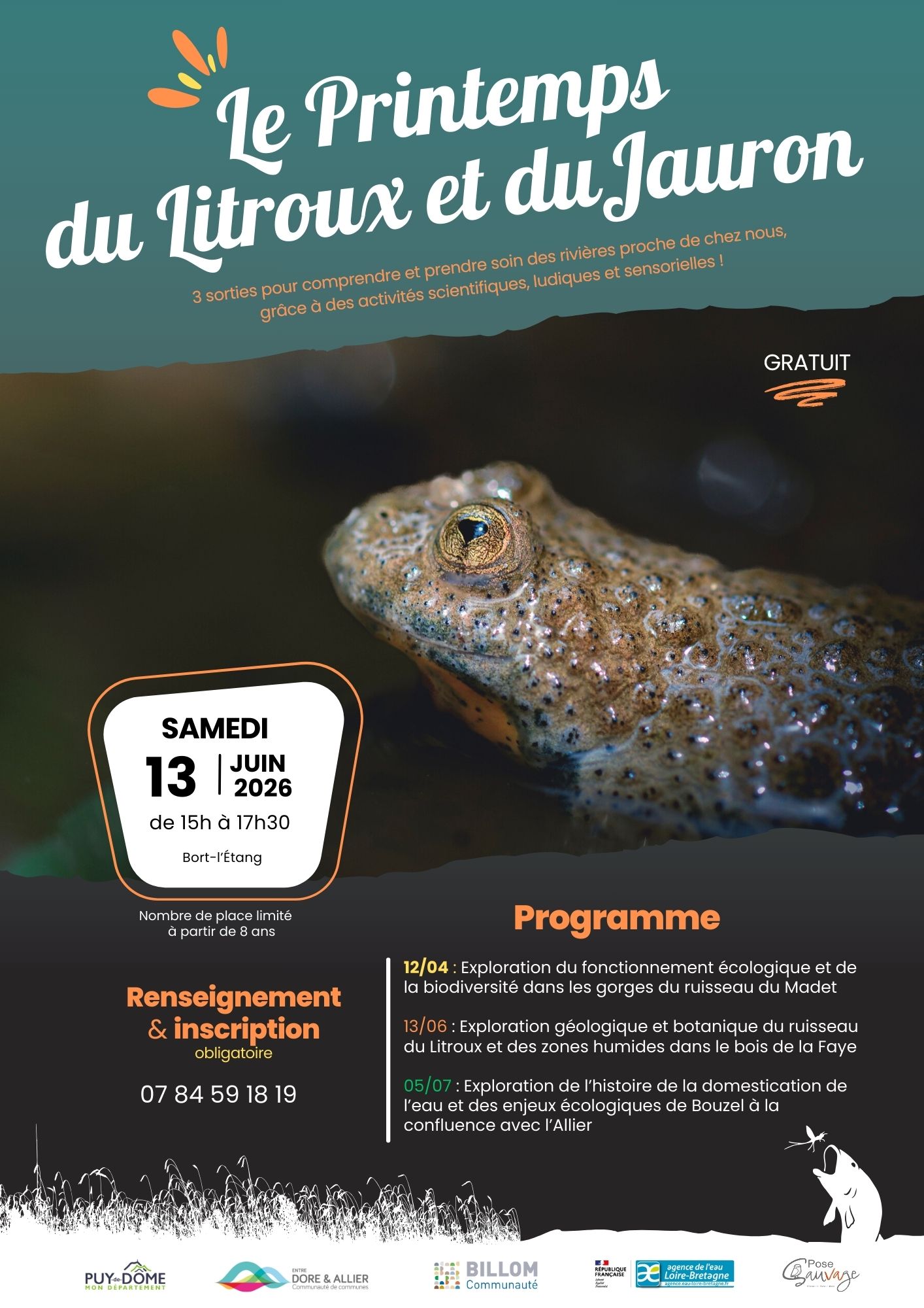 Pour la 2ème sortie du « Printemps du Litroux et du Jauron », vous explorerez avec Vincent Amaridon le ruisseau du Litroux qui serpente dans le bois de la Faye sur la commune de Bord l’Etang. Lors de cette balade géologique et botanique, vous apprendrez à mieux connaître les zones humides, les boisements rivulaire et à comprendre leurs importances pour les êtres vivants et le cycle de l’eau.