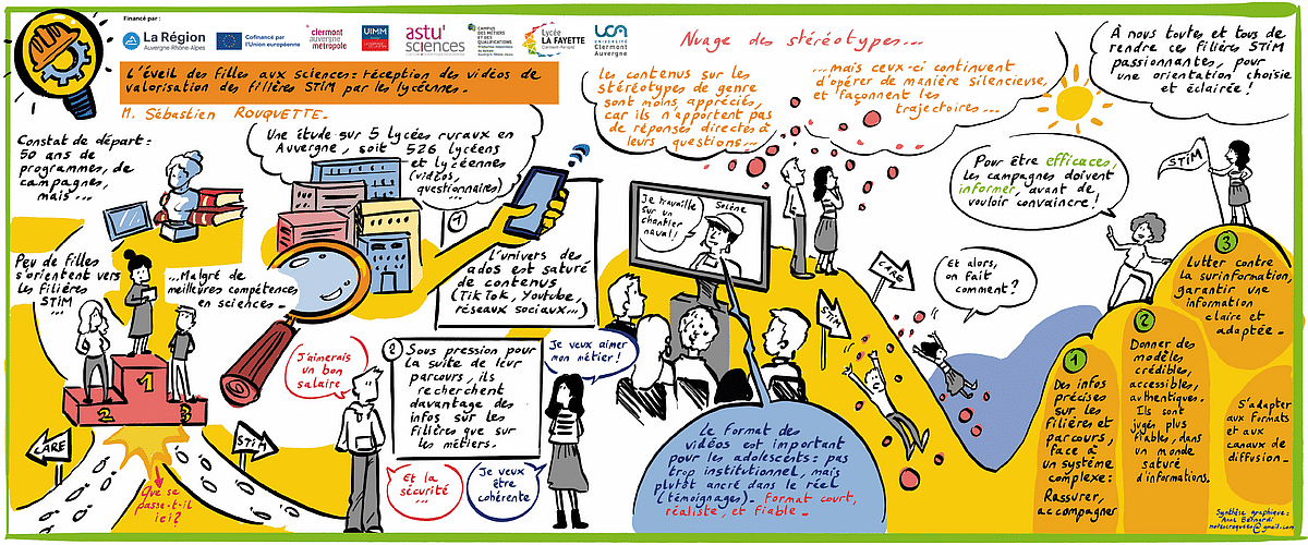 Pour son temps final d'acculturation, le groupe de travail "Égalité, territoires et Orientation scientifique et technique vers les métiers de l'industrie", a invité Sébastien Rouquette, Professeur des Universités en Sciences de l'information et de la communication Laboratoire Communication et sociétés - UFR LCC - Université Clermont Auvergne, afin qu'il présente les résultats de son enquête menée auprès de 500 lycéennes et lycéens auvergnats (5 lycées des 4 départements de l'Auvergne, éloignés de Clermont-Ferrand), qui analyse comment les contenus d’orientation sont reçus par les jeunes, dans un environnement saturé d’informations dominé par l’urgence des choix scolaires et les codes des réseaux sociaux.