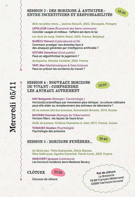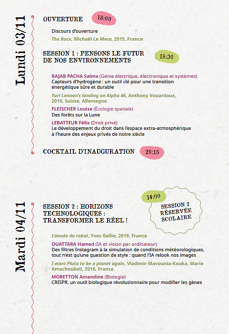 Les interventions auront cette année pour objectif de questionner les futurs possibles, qu'ils soient technologiques 🤖, environnementaux 🌍, philosophiques 💭, sociétaux 🤝 ou expérimentaux 🔬.