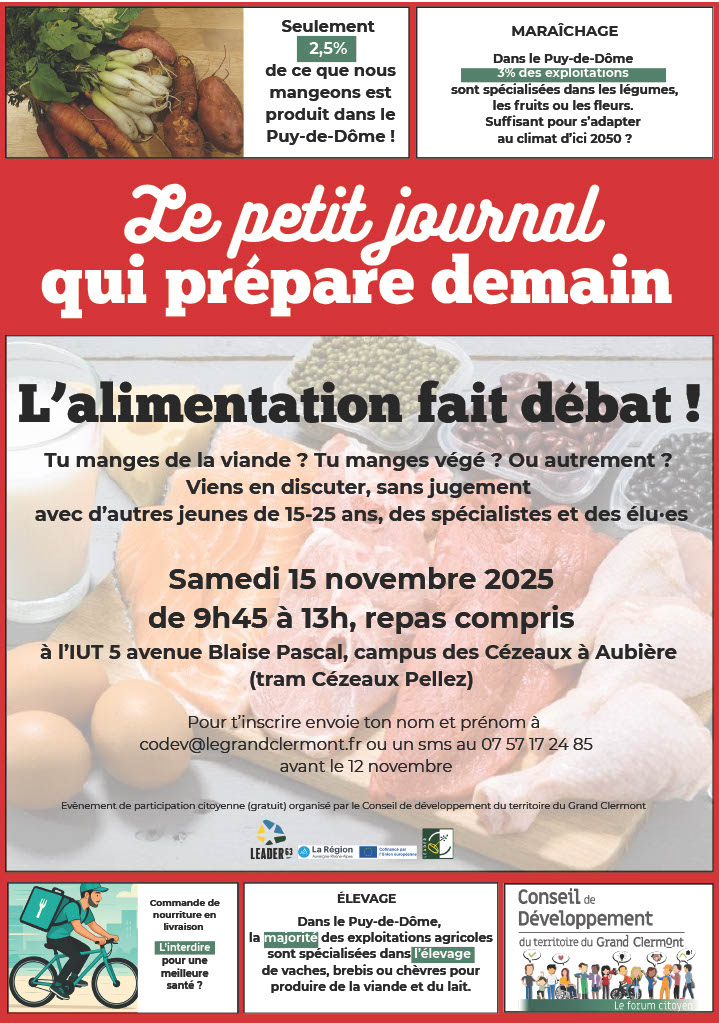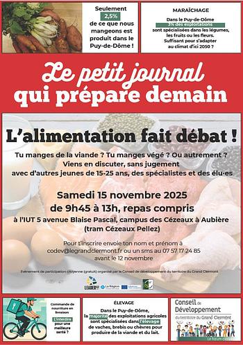 Les citoyens du Conseil de développement du territoire du Grand Clermont (instance de participation citoyenne) organisent une rencontre entre jeunes de 15-25 ans sur le thème de l'alimentation, en présence d'experts de l'INRAE (Marine Gueugneau et Pascal Carrère) et d'élus.