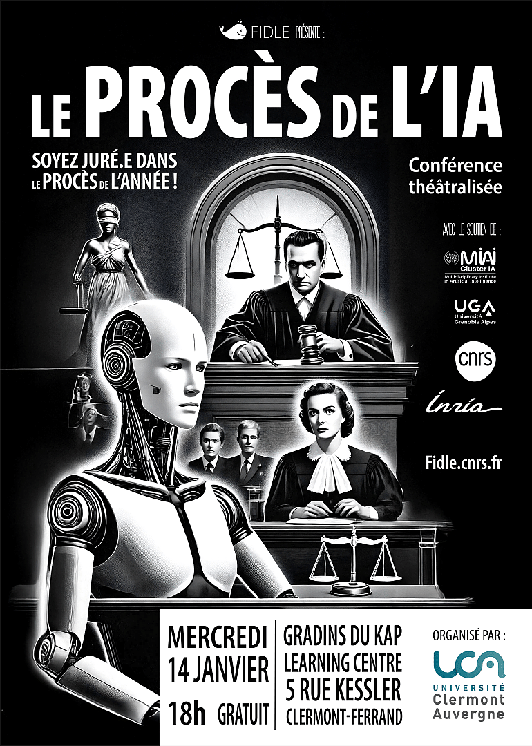 Ce procès fictif met en lumière 16 chefs d’accusation majeurs : impact environnemental, violation de la vie privée, singularité technologique, opacité des algorithmes, droit d’auteur, perte d’autonomie, harcèlement, manipulation, impact social et économique, etc. Autant de sujets qui inquiètent le grand public et auxquels cette conférence apporte des réponses claires et accessibles.