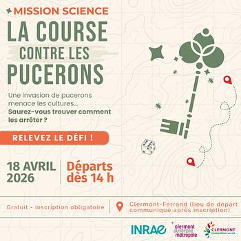 À l’occasion de la Clermont Innovation Week, INRAE vous propose une expérience immersive à vivre en famille ou entre amis : une chasse au trésor urbaine au cœur de Clermont-Ferrand. Votre mission : progresser d’étape en étape en résolvant des énigmes, pour lutter contre l'invasion de pucerons. Au fil du parcours, vous découvrirez ainsi comment les scientifiques conçoivent et utilisent des jeux sérieux pour explorer des solutions et accompagner la prise de décision face à des enjeux agricoles, sociétaux ou environnementaux.